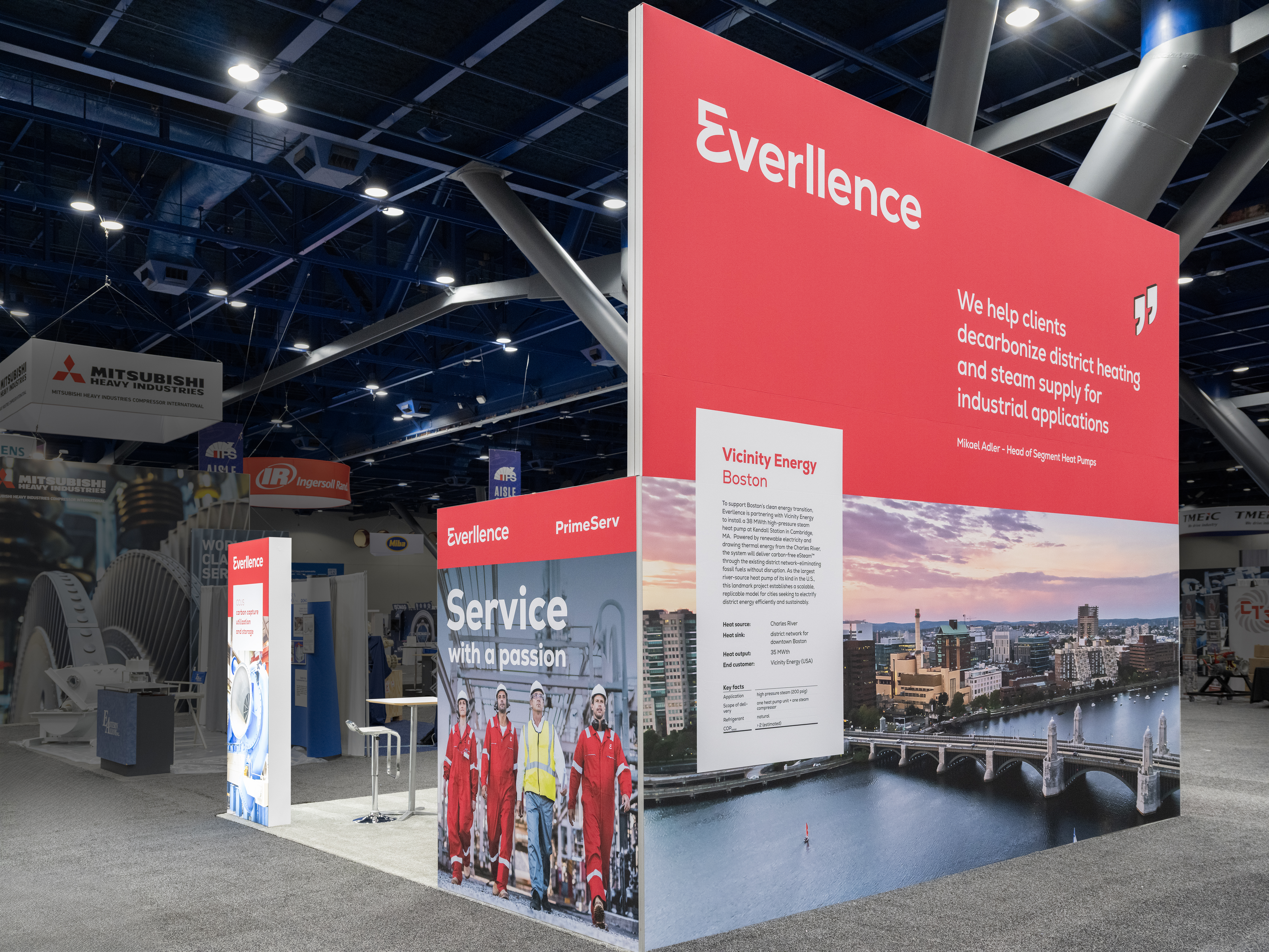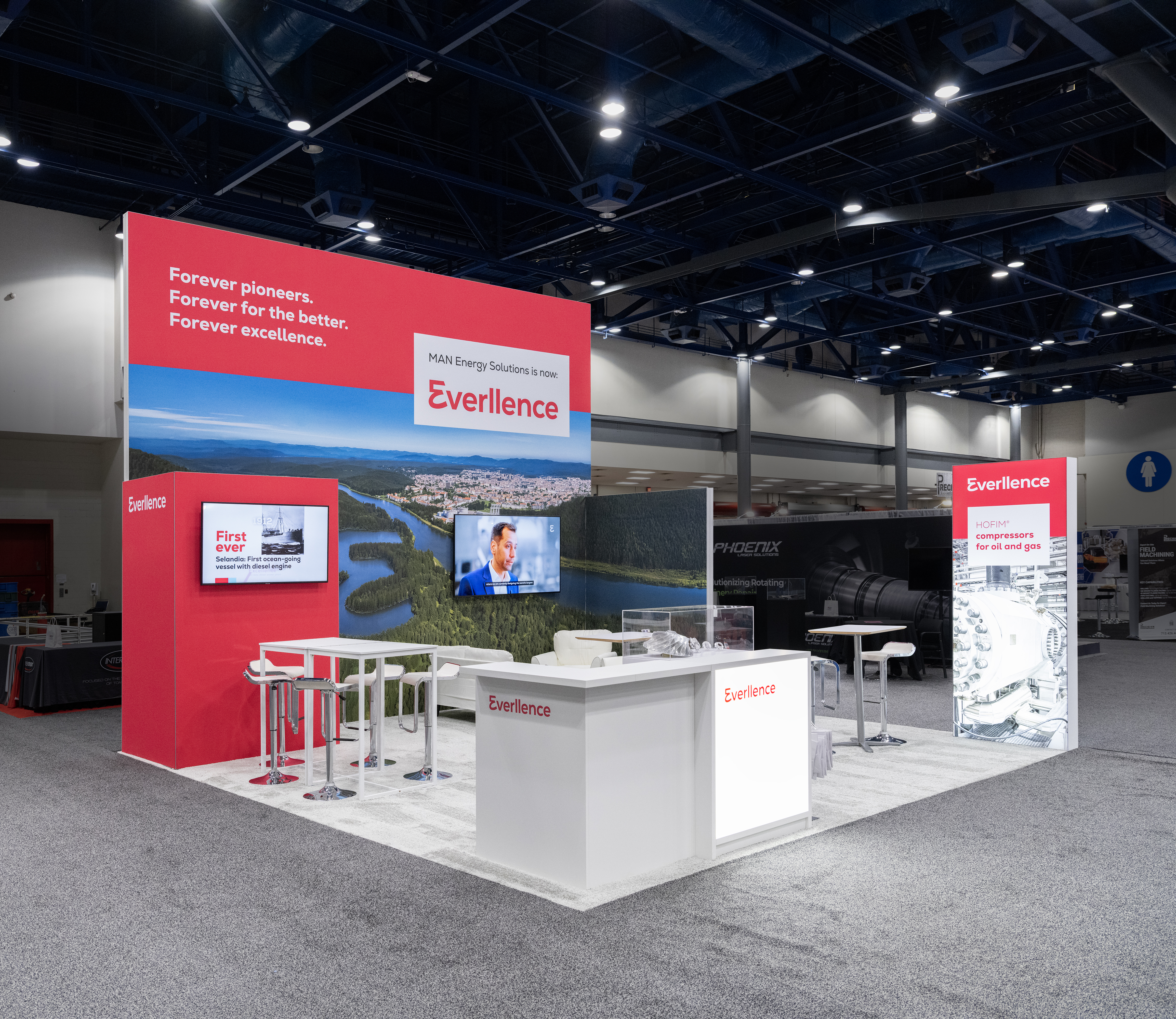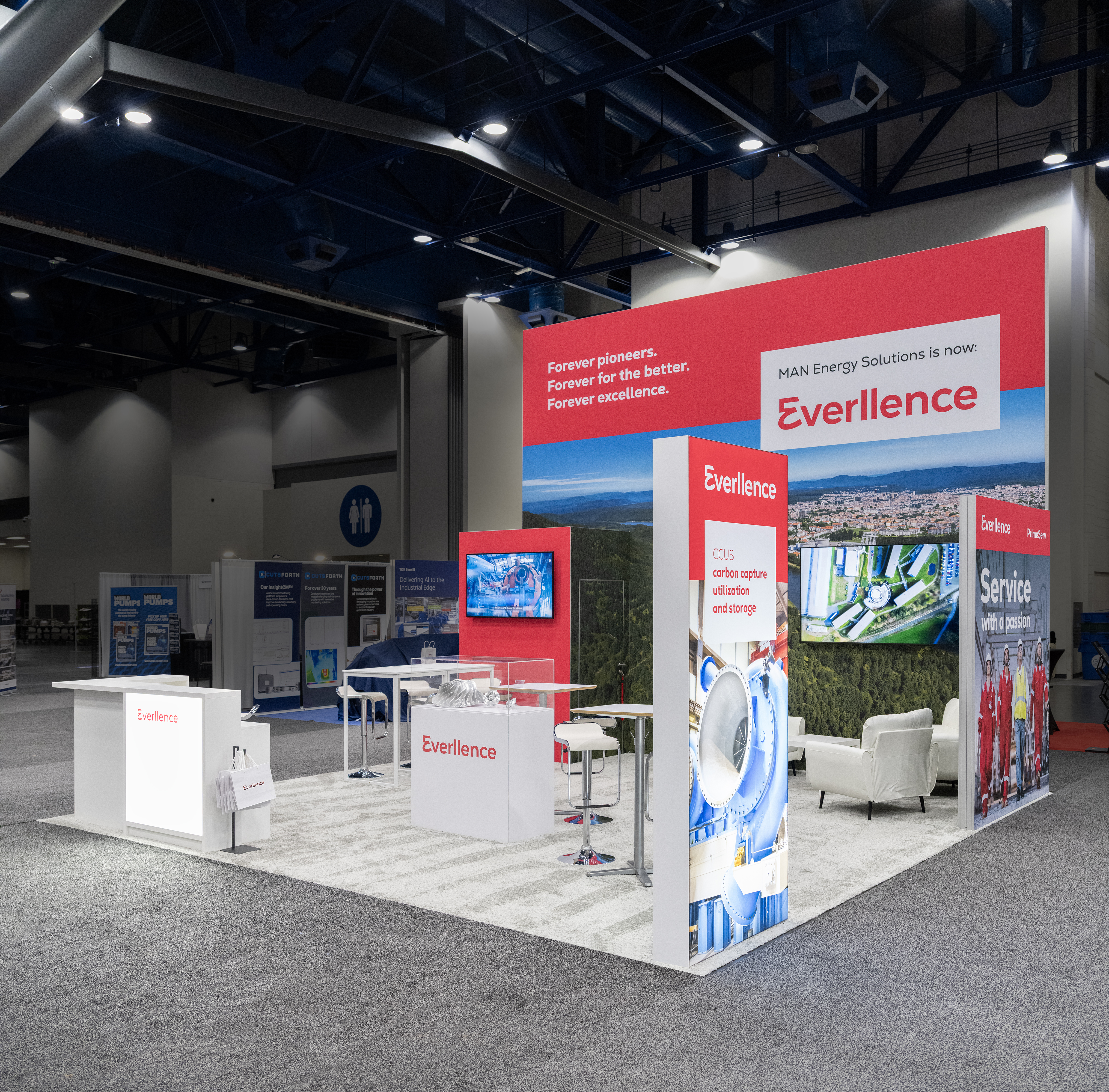 Für Everllence SE – vormals MAN Energy Solutions – durften wir den 50 m² großen Messestand auf der Turbo Machinery & Pump Symposia 2025 in Houston/Texas realisieren. Ziel des Auftritts: die Markenvorstellung und von Everllence in den USA und die Präsentation des breiten Leistungsportfolios rund um Dekarbonisierung, hocheffiziente Antriebstechnik sowie CO₂-Abscheidung und -Nutzung.
