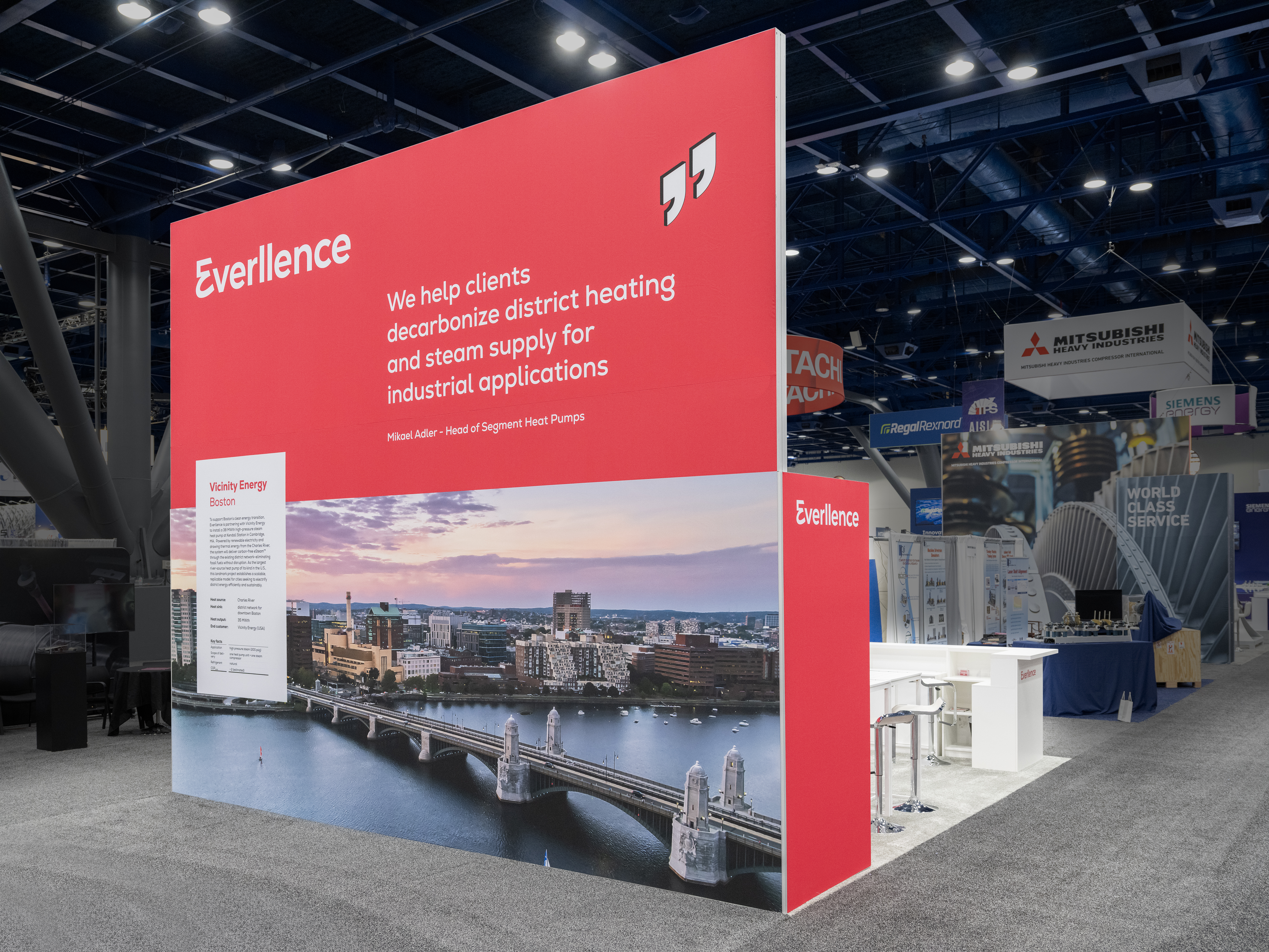 Der Messestand setzte genau das um: Klar, selbstbewusst, und mit hoher Fernwirkung. Die fünf Meter hohe Rückwand bildete das visuelle Zentrum – satt bedruckt, mit der neuen Unternehmensfarbe, dem Mission Statement und dem markanten Everllence-Branding. Schon aus der Distanz war klar, wofür die Marke steht.