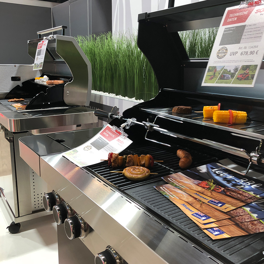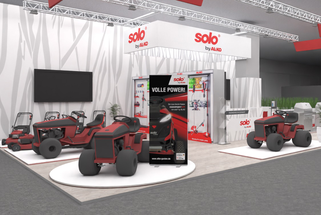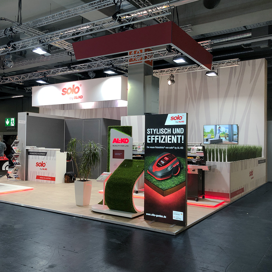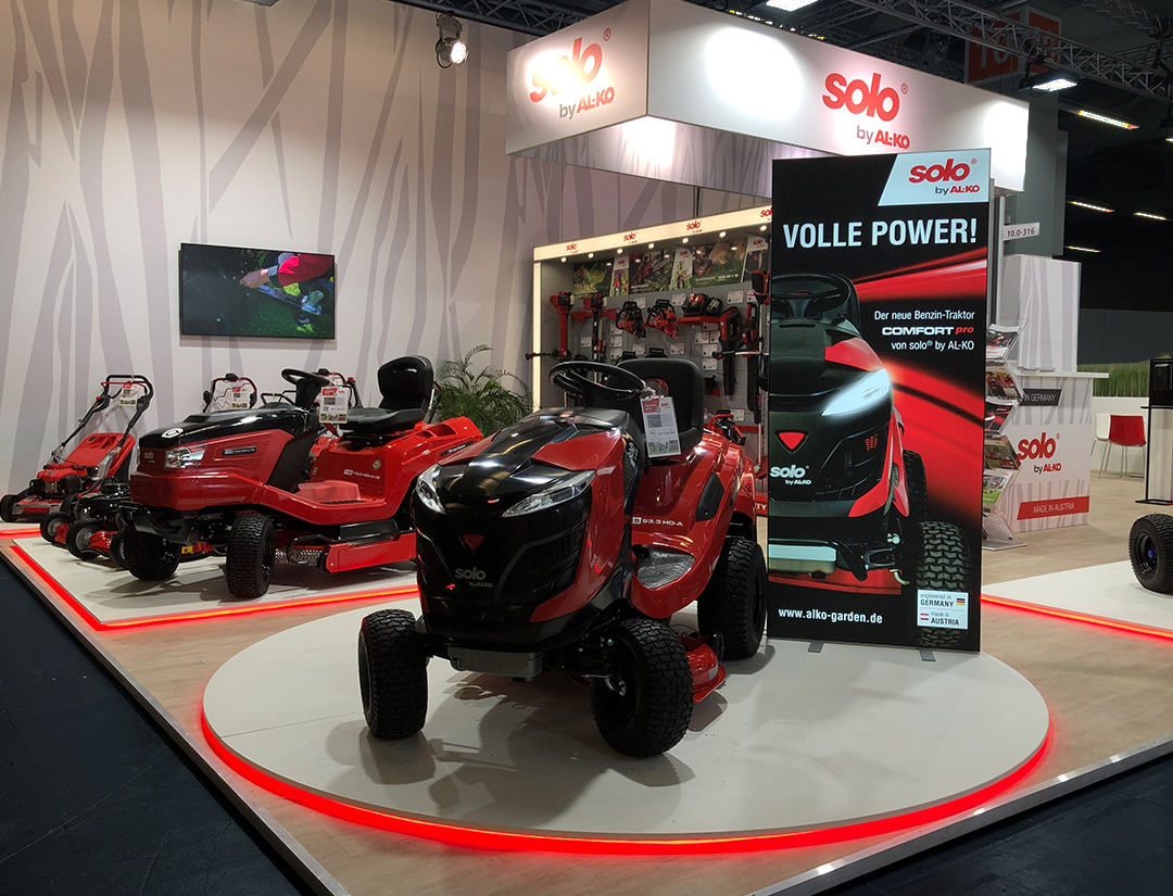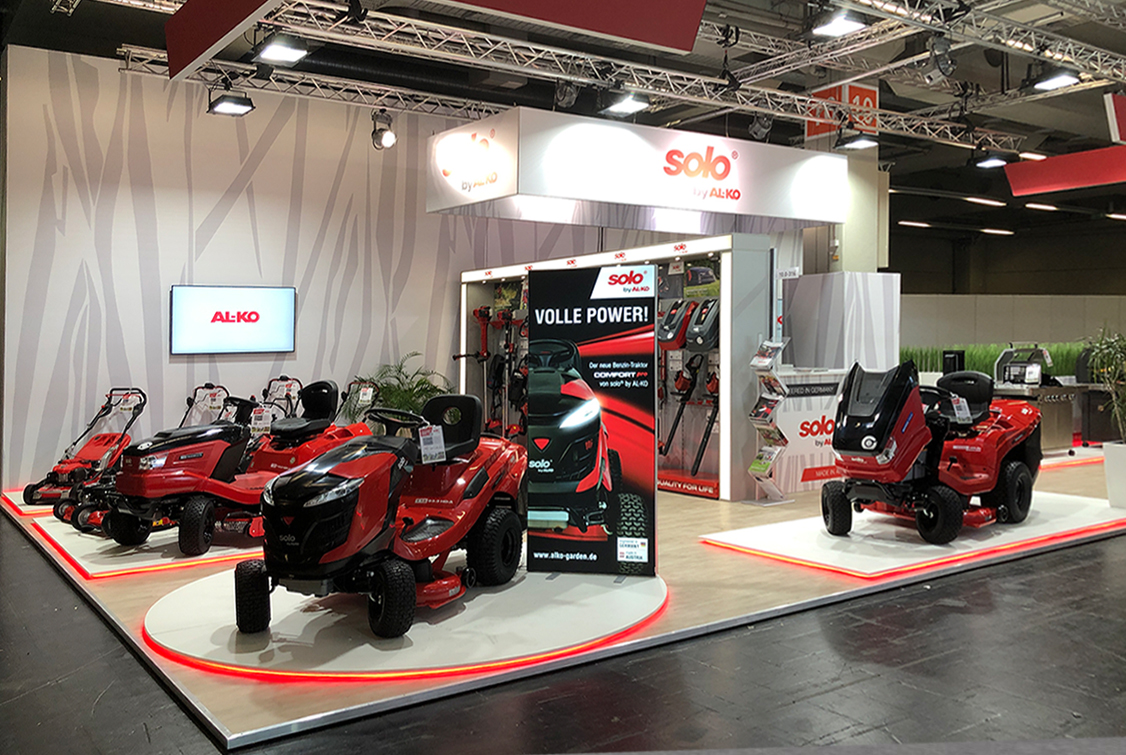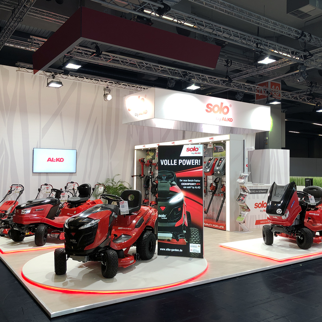 Messestandkonzeption und Messedesign für die AL-KO Geräte GmbH – den Spezialisten für professionelle Garten- und Landschaftsbautechnik. Nach den eher rustikalen Messeauftritten der vergangenen Jahre entschied sich das Unternehmen für ein deutlich aufgeräumteres, cleanes Erscheinungsbild, das den Fokus klar auf die Produkte lenkt. Helle Gestaltungselemente und grafische Motive in Form von Grashalmen rücken Rasenmäher, Heckenscheren, Motorsägen und weitere Geräte bewusst in den Mittelpunkt. Für ausgewählte Produkte entstanden maßgeschneiderte Präsentationsplattformen mit LED-Unterleuchtung, die die Geräte optisch hervorheben.