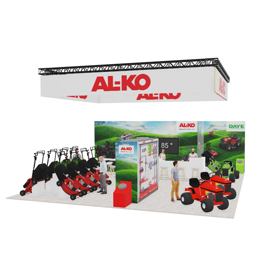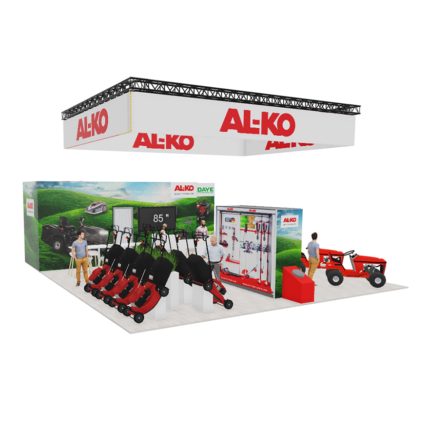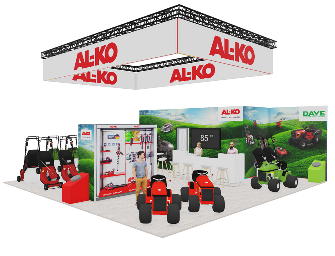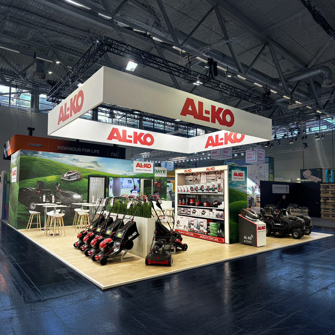 Für die spoga+gafa 2025 in Köln realisiert das eest!-Team erneut den Messeauftritt der AL-KO Geräte GmbH. Auf 11 × 10 Metern entsteht ein moderner, klar gegliederter Stand, der die professionellen Garten- und Landschaftsbaugeräte wirkungsvoll präsentiert. Die helle, reduzierte Gestaltung lenkt den Fokus auf die Produkte, während grafische Naturmotive die Markenwelt unterstreichen.