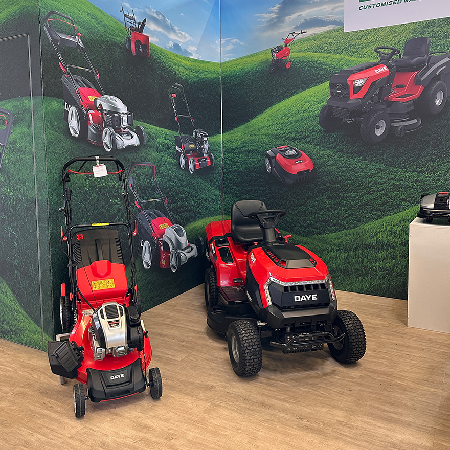 Auf Grundlage einer detaillierten 3D-Planung wird der Stand in die beiden Bereiche Produktpräsentation und Kommunikation gegliedert. Die Geräte werden auf hochwertig gestalteten Präsentationsflächen mit einer ruhigen, reduzierten Gestaltung platziert, sodass Besucher die Maschinen direkt wahrnehmen und deren Besonderheiten schnell erfassen können. Grafische Elemente im Stil natürlicher Strukturen unterstützen die Markenidentität und verbinden die Produktpräsentation mit dem Garten- und Landschaftsbauumfeld.