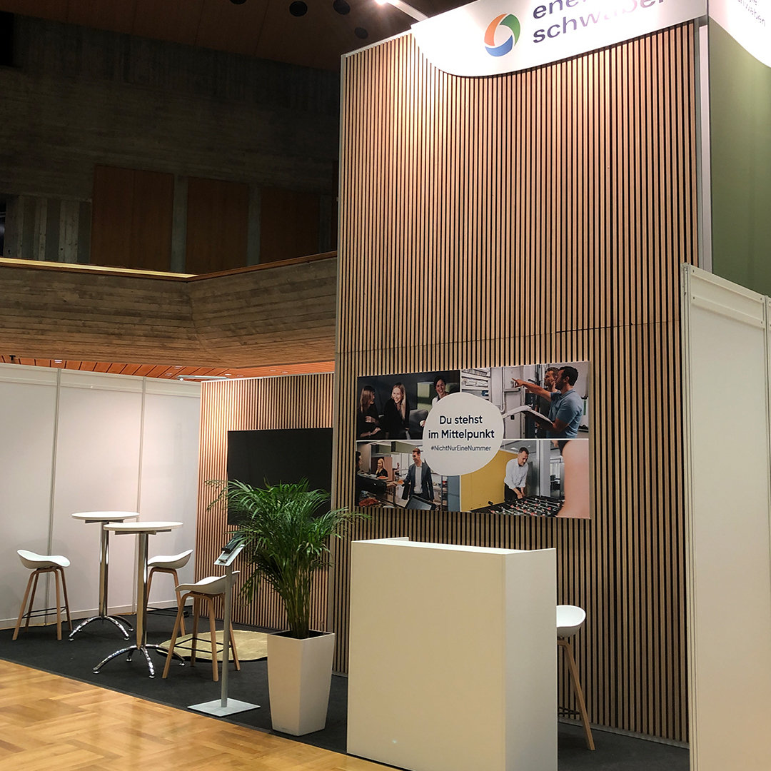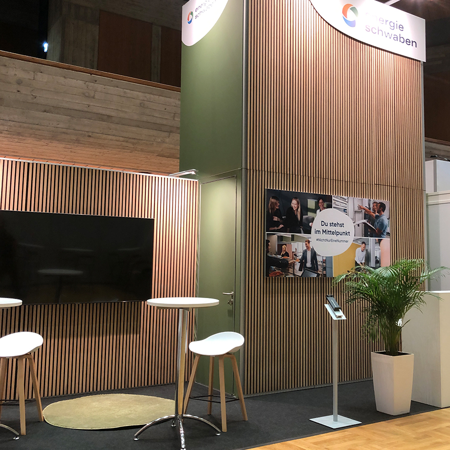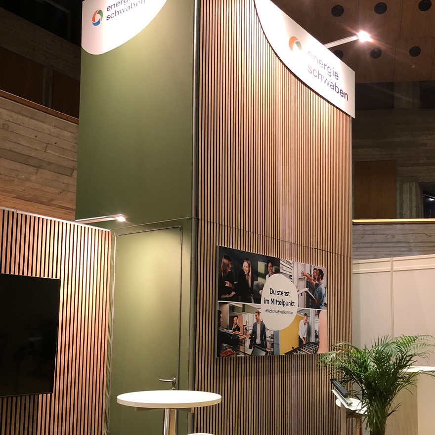 Mit einem fünf Meter hohen Turm als Blickfang präsentierte sich energie schwaben GmbH auf der vocatium 2023. Im Mittelpunkt der Messeplanung stand das Thema Nachhaltigkeit – daraus entstand das Konzept „ein Messestand für 3+ Messen“. Der Stand wurde so entwickelt, dass er mehrfach genutzt werden kann. Gemeinsam mit unserem erfahrenen Messebaupartner setzten wir dieses Konzept erfolgreich um. Auf der vocatium in Augsburg kam der Stand bereits zum zweiten Mal zum Einsatz. Rahmensystem, Textildrucke und Mobiliar konnten problemlos wiederverwendet werden, ohne neue Produktion. Jetzt freuen wir uns schon auf seinen dritten Einsatz.