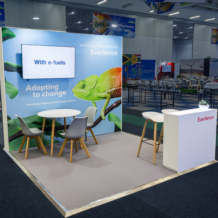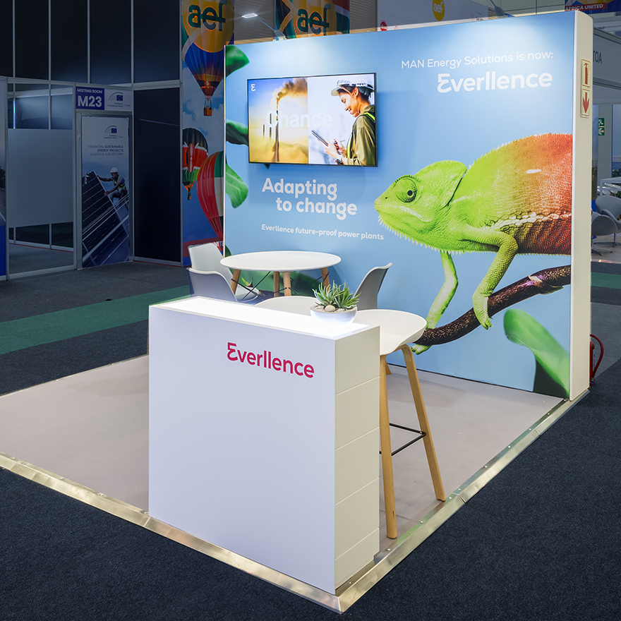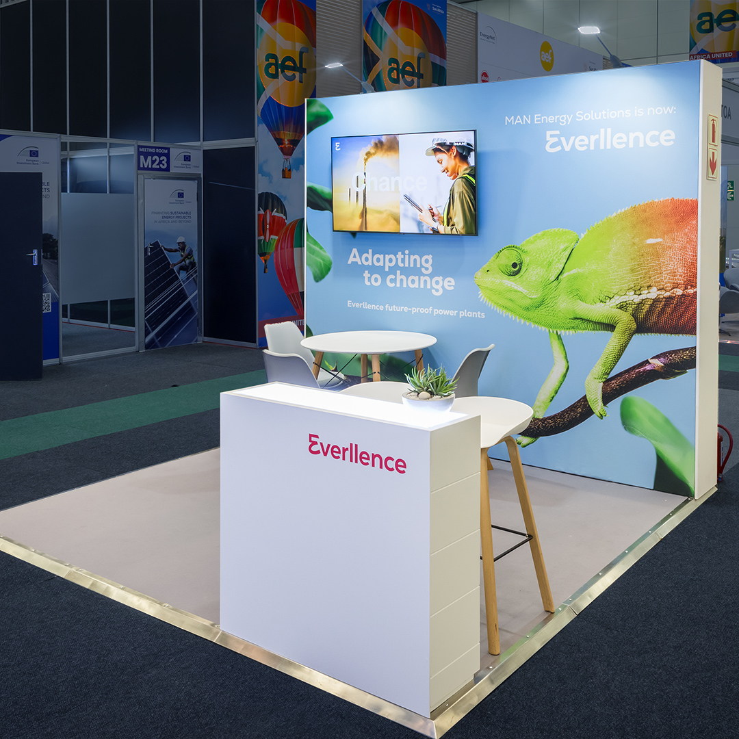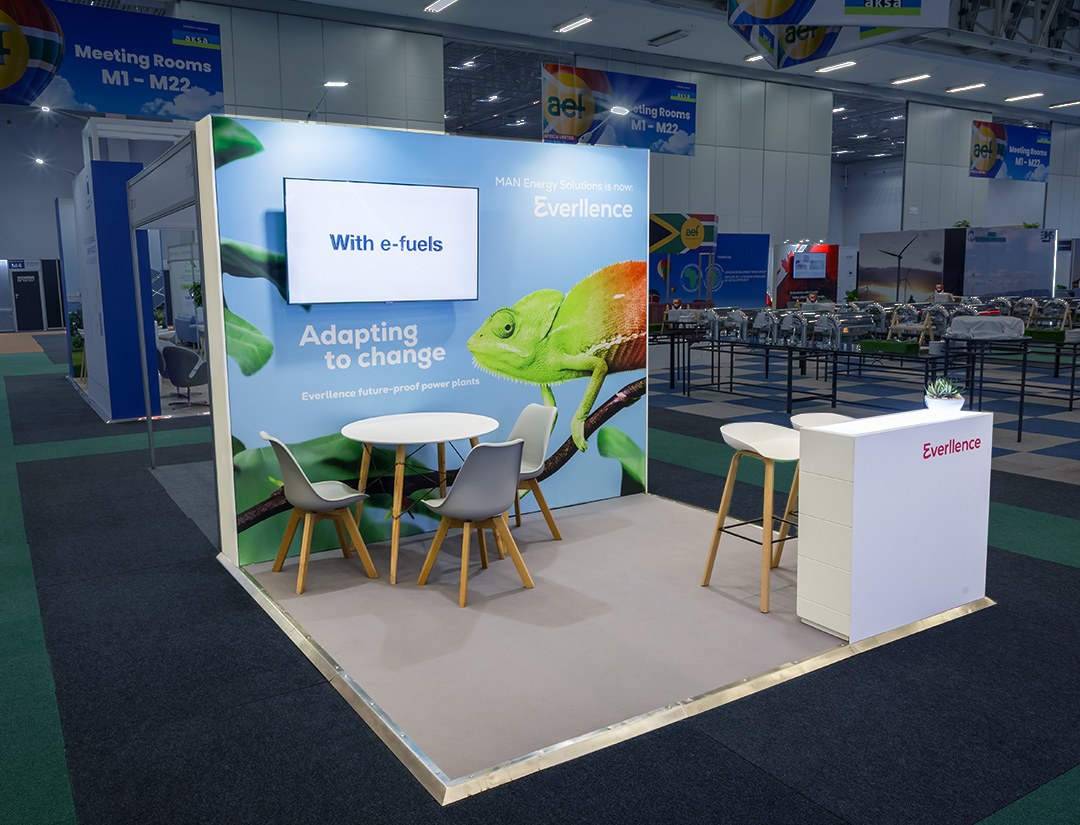 Nachhaltigkeit spielte – wie bei allen Everllence-Projekten – eine wesentliche Rolle. Wo möglich wurden wiederverwendbare Bauteile eingesetzt und grafische Elemente modular angelegt, um zukünftige Einsätze zu ermöglichen. So entstand ein Messestand, der auch auf kleiner Fläche maximale Markenpräsenz erzielt, gleichzeitig ressourcenschonend geplant ist und Everllence im afrikanischen Energiemarkt sichtbar positioniert.