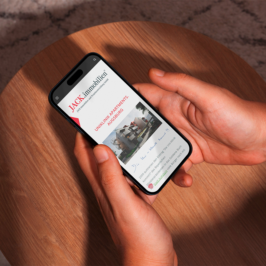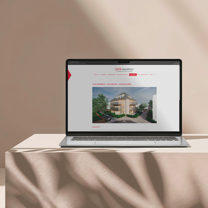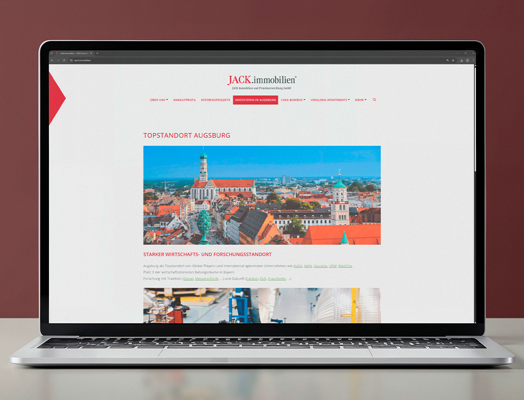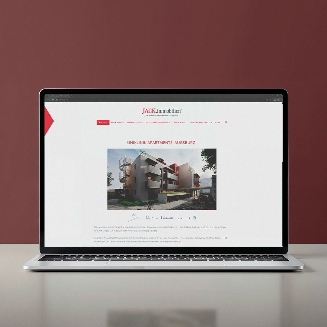 Für die JACK Immobilien Projektentwicklung GmbH in Augsburg übernahm das eest!-Team die Beratung, Konzeption, Gestaltung und organisatorische Umsetzung der Projektwebsite. Auch nach dem Launch betreuen wir die Seite weiter und übernehmen inhaltliche Updates, Layoutanpassungen sowie technische Änderungen nach Kundenwunsch.
