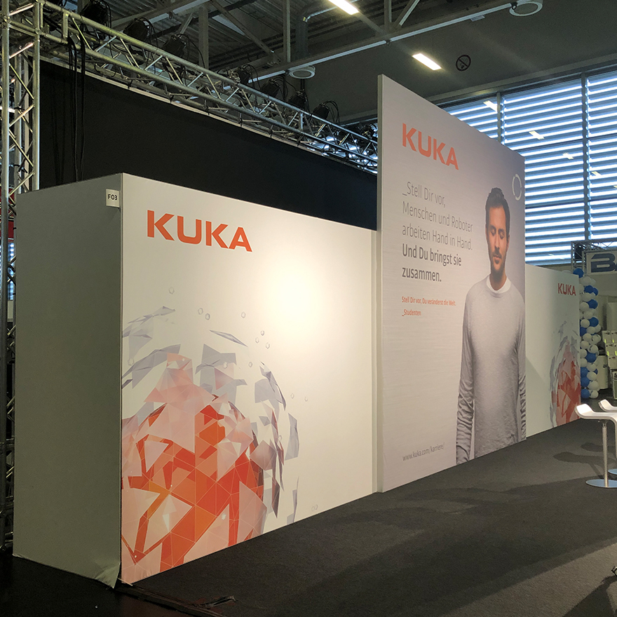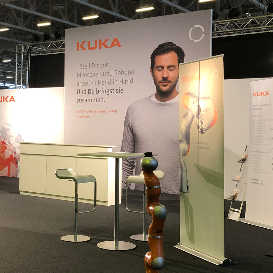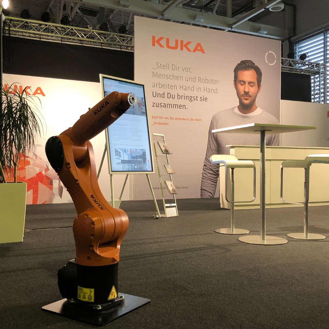 Auch 2023 gestalteten wir den Messestand der KUKA Aktiengesellschaft auf der Ausbildungsmesse Fit for JOB! in Augsburg. Auf 80 m² entstand ein nachhaltiger, einladender Stand, der Besucher über die Ausbildungsberufe informierte.