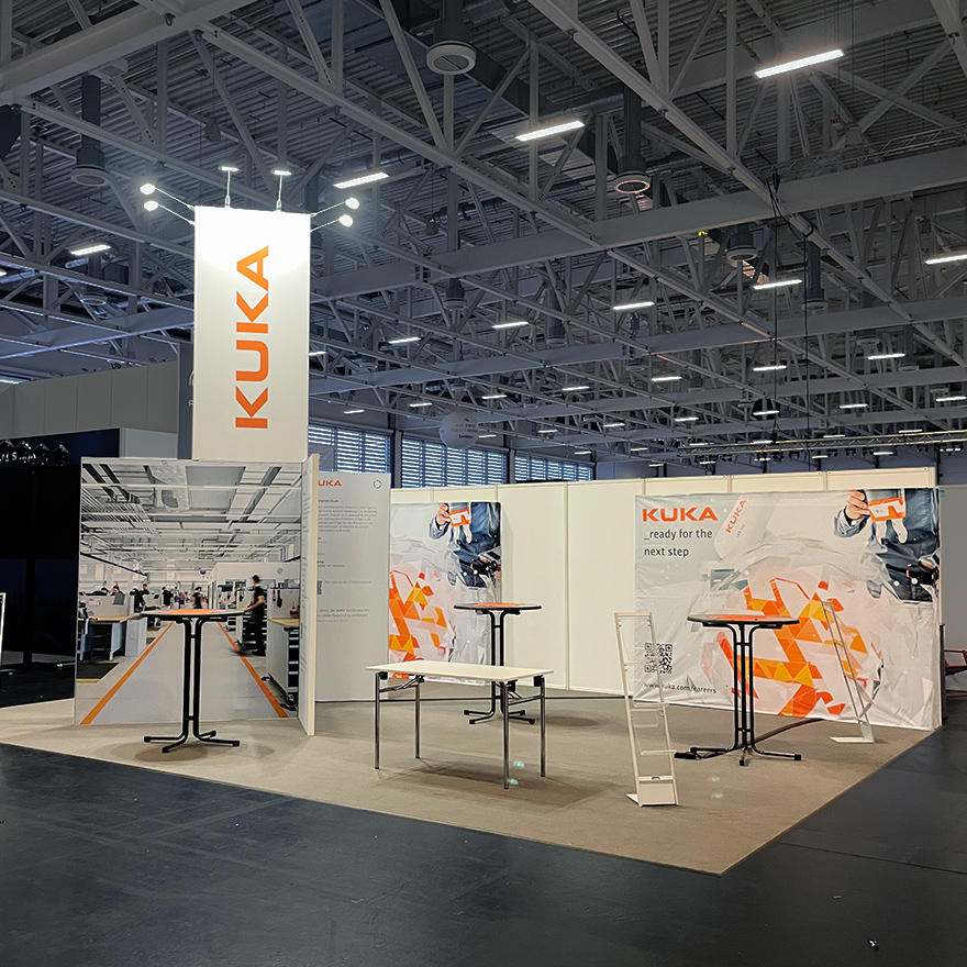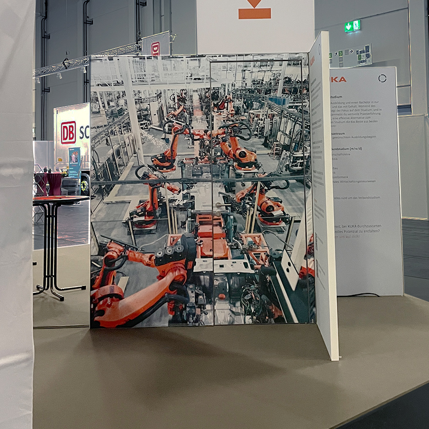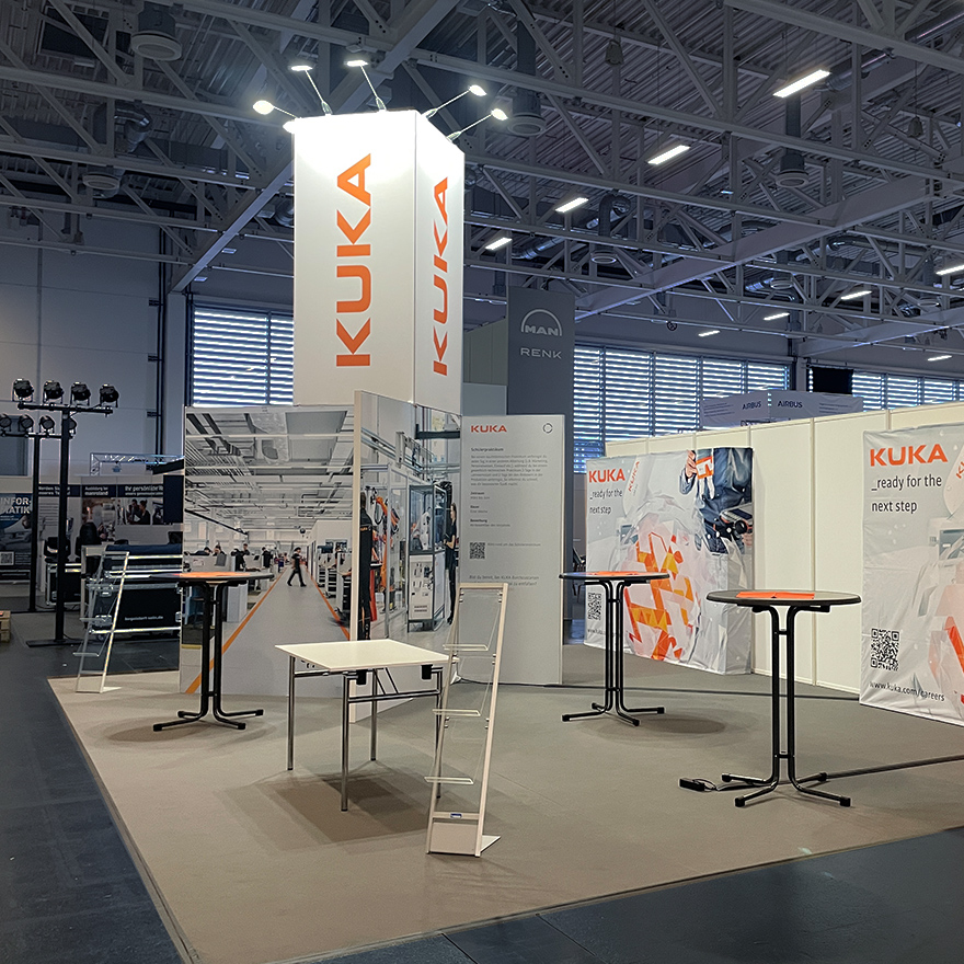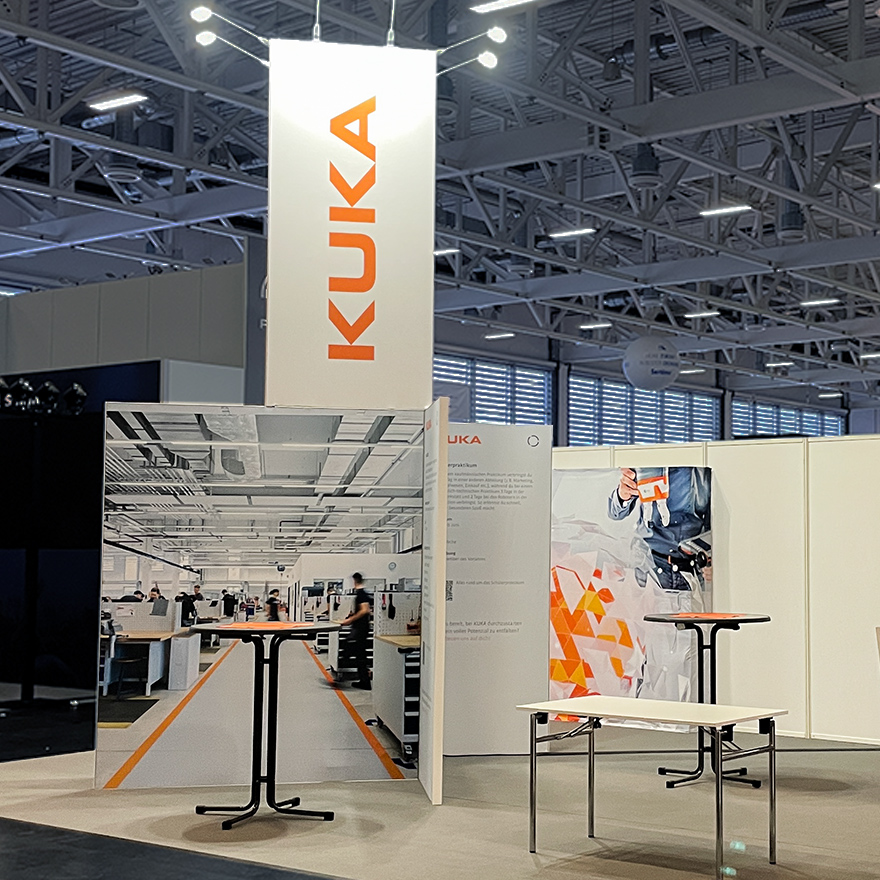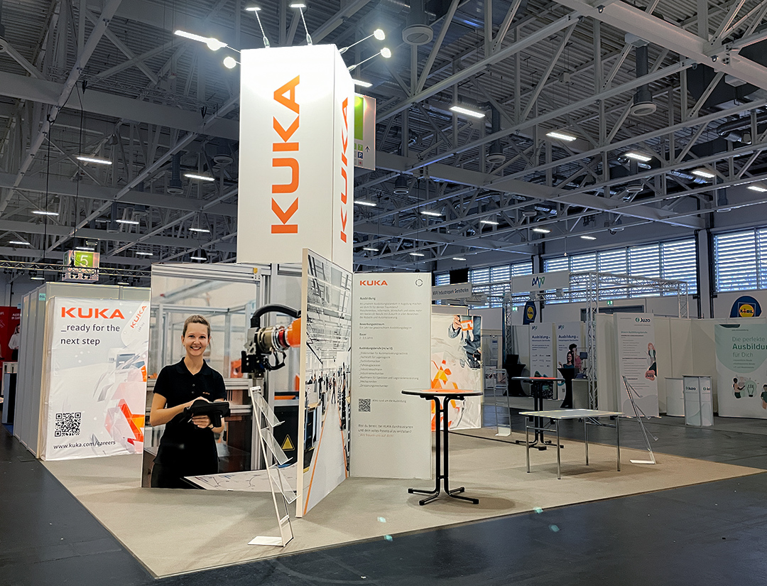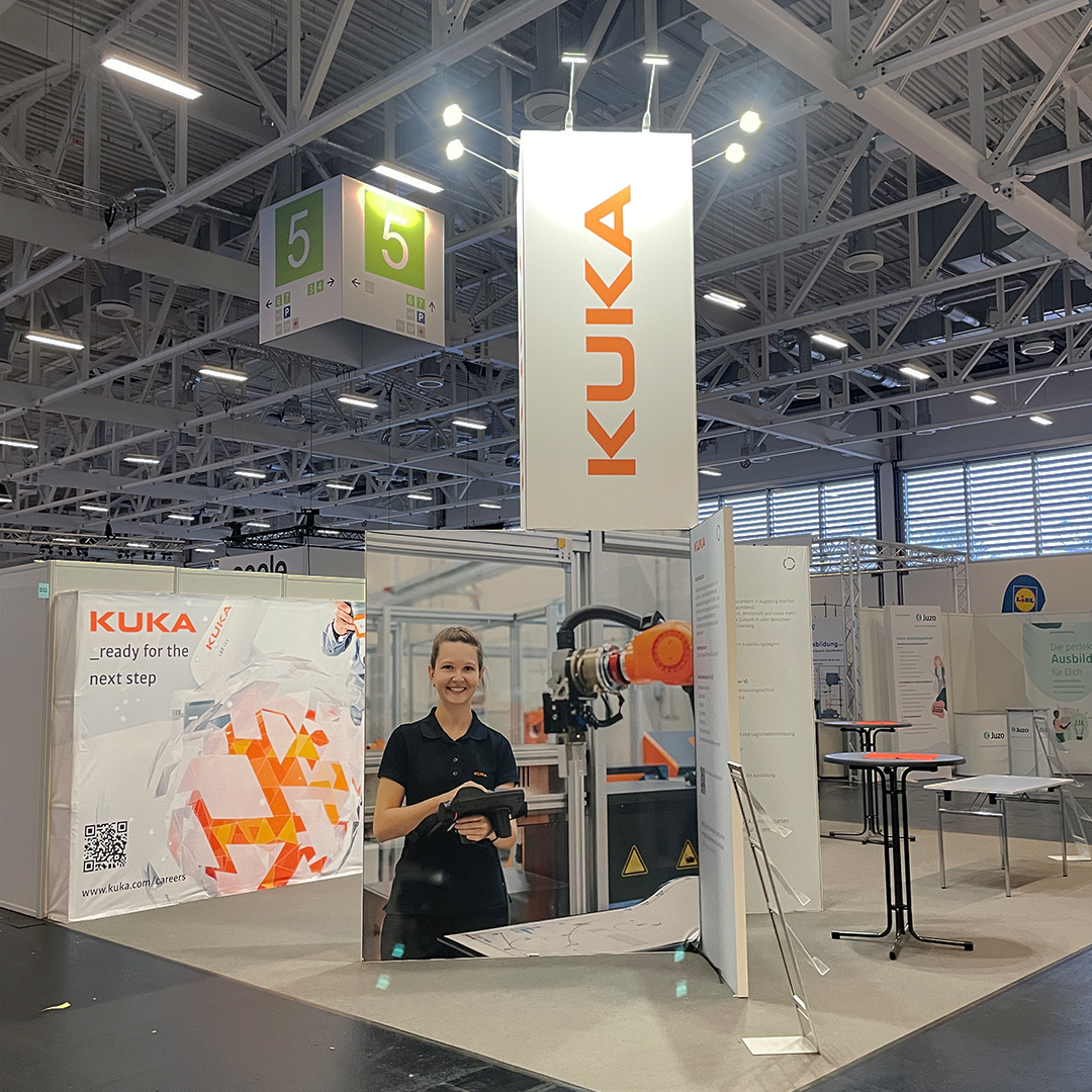 Das Ergebnis: ein moderner, einladender Messeauftritt, der Besucher anspricht und Orientierung bietet – ideal für die Nachwuchsgewinnung bei KUKA.