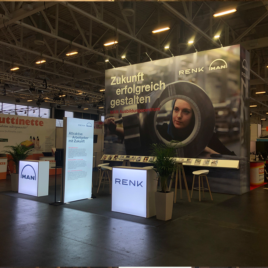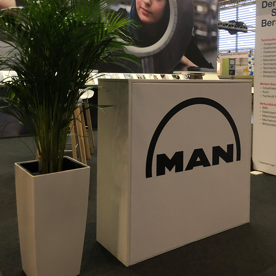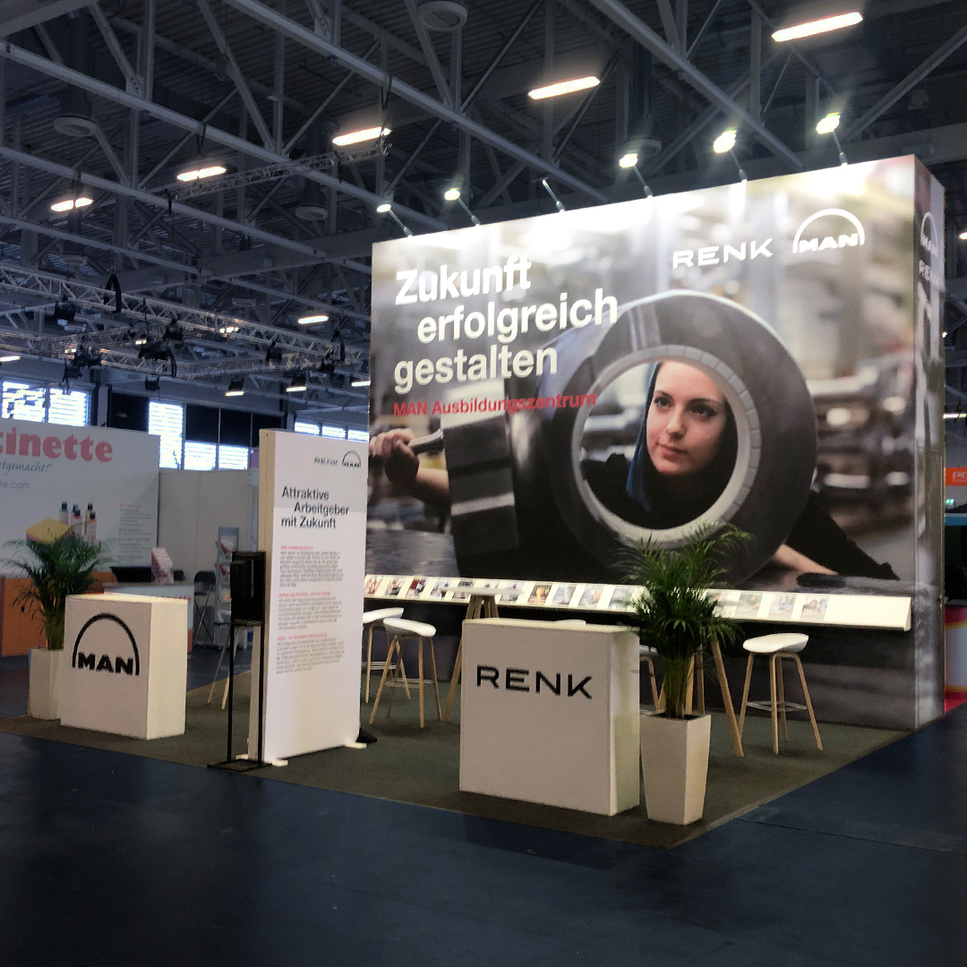 Showstopper – mit dem entwickelten Messekonzept für unseren Kunden MAN Energy Solutions haben wir einen Messestand gestaltet, der auf der Ausbildungsmesse fitforJOB in Augsburg garantiert alle Blicke auf sich zog. Auf einer Standfläche von 36 m² konnten sich zahlreiche Besucher umfassend über die verschiedenen Ausbildungsberufe informieren.