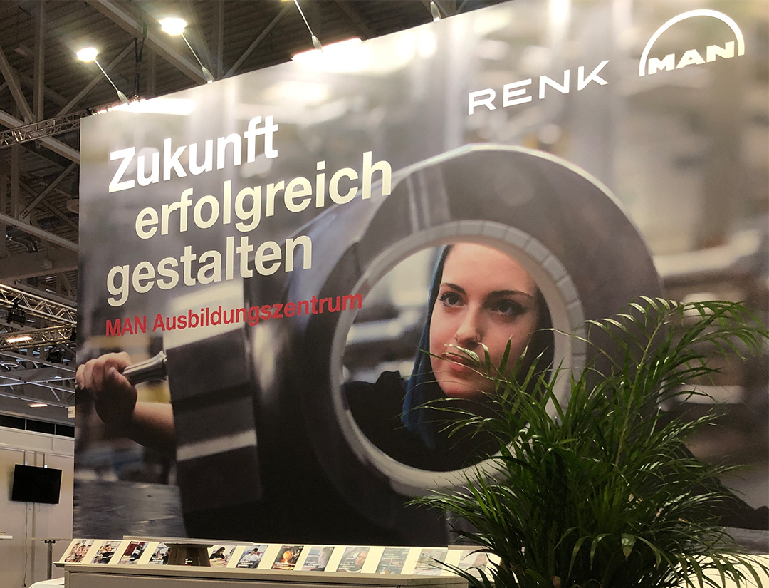 Auf der fitforJOB präsentierte sich MAN Energy Solutions mit einem markanten 36-m²-Messestand. Ein integriertes Prospektregal bot Orientierung über die Ausbildungsberufe, während die fünf Meter hohe Rückwand mit Fernwirkung und Kabine den Stand zum echten Hingucker machte.