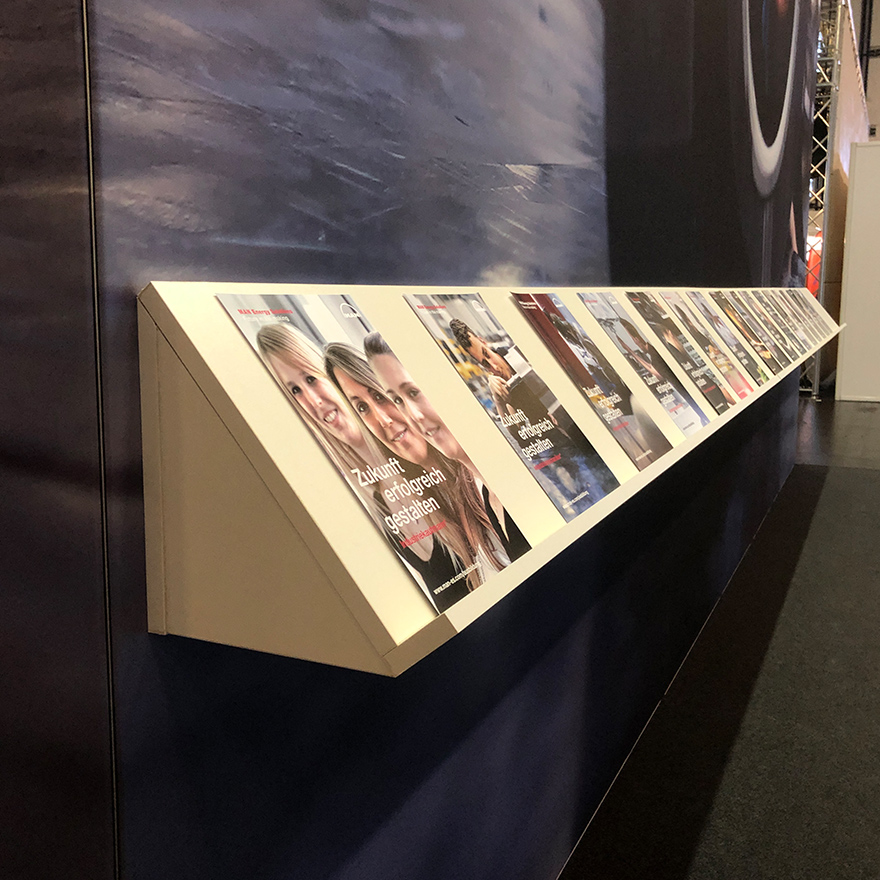Ein in die Rückwand integriertes Prospektregal präsentierte übersichtlich alle Informationsmaterialien zu den jeweiligen Ausbildungsrichtungen. Dadurch entstand ein klar strukturierter, gut zugänglicher Bereich für Schüler, Eltern und Lehrkräfte.