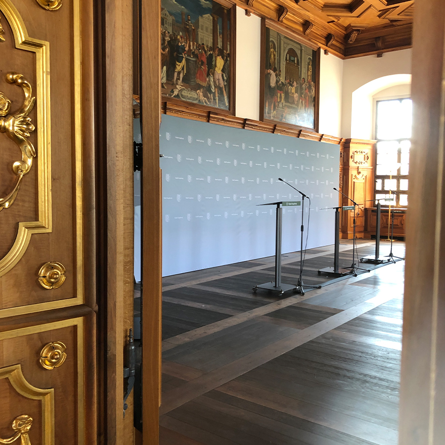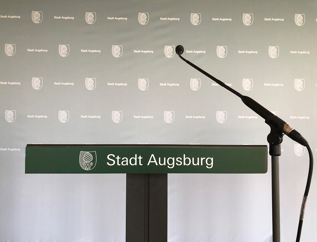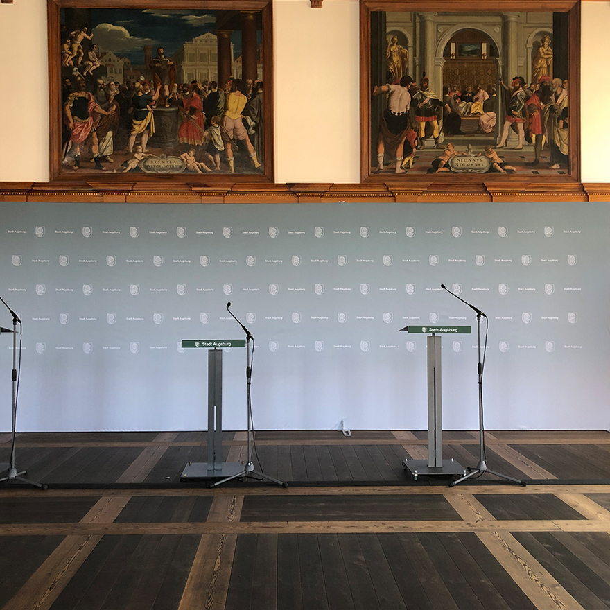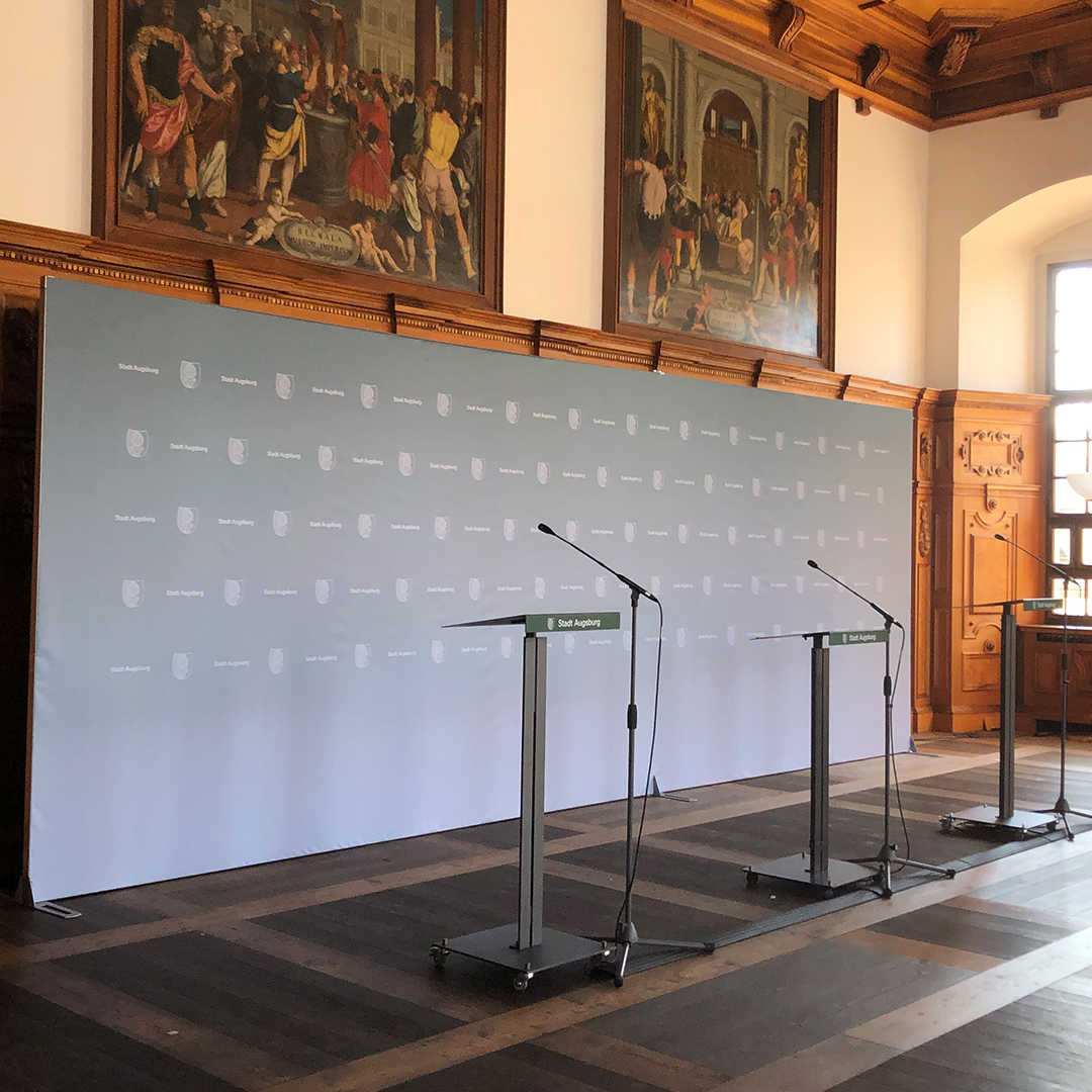 Konzeption und Systemauswahl für die mobile und flexibel erweiterbare Pressewand für die Stadt Augsburg. In Zeiten der Coronapandemie benötigen die Vertreter der Stadt Augsburg – an der Spitze die Oberbürgermeisterin – für Pressekonferenzen, Videobotschaften und Mitteilungen an die Bevölkerung eine mobile und flexible erweiterbare Presserückwand.